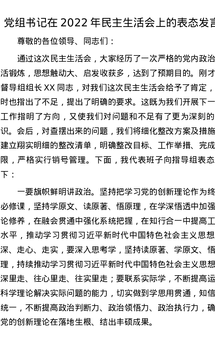 表态发言:党组书记在2022年民主生活会上的表态发言