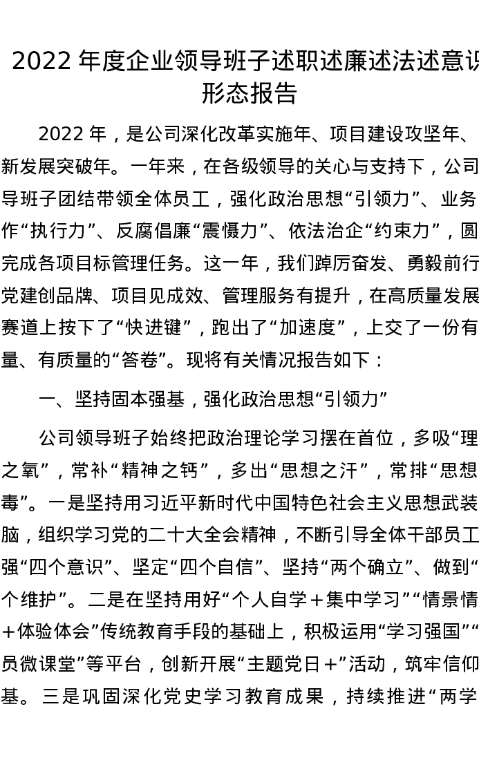 2022年度企业领导班子述职述廉述法述意识形态报告