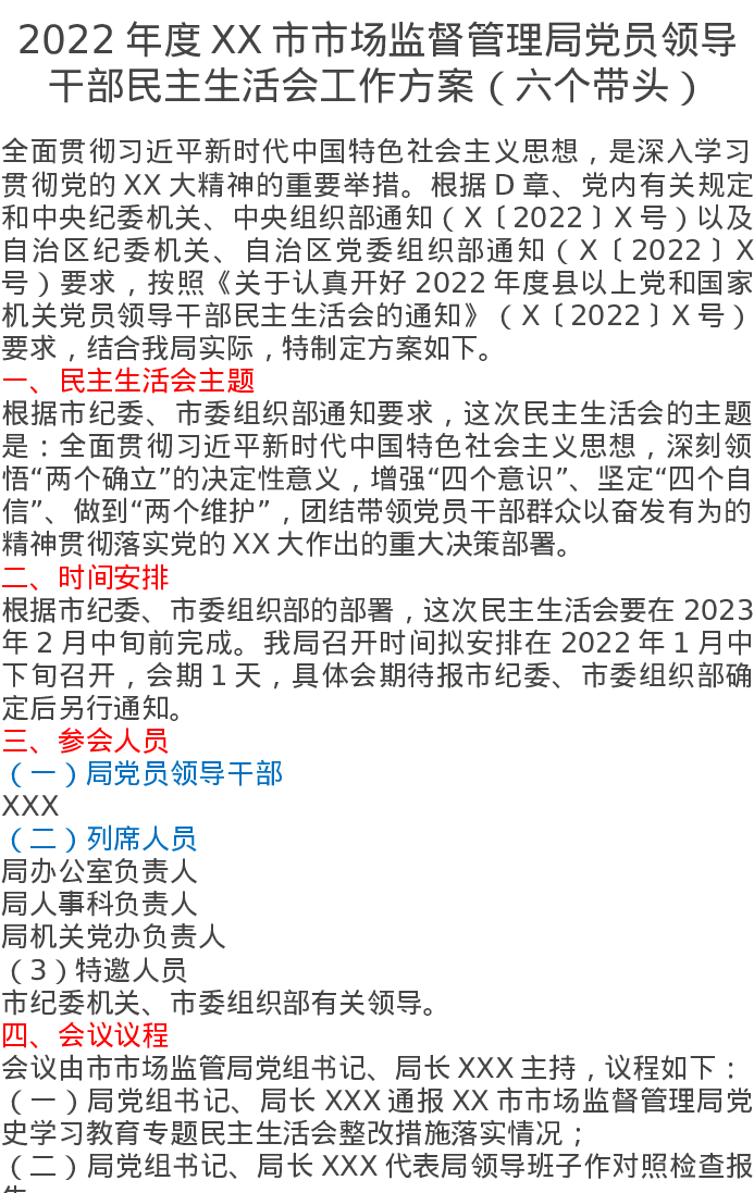 2022年度XX市市场监督管理局党员领导干部民主生活会工作方案(六个带头)
