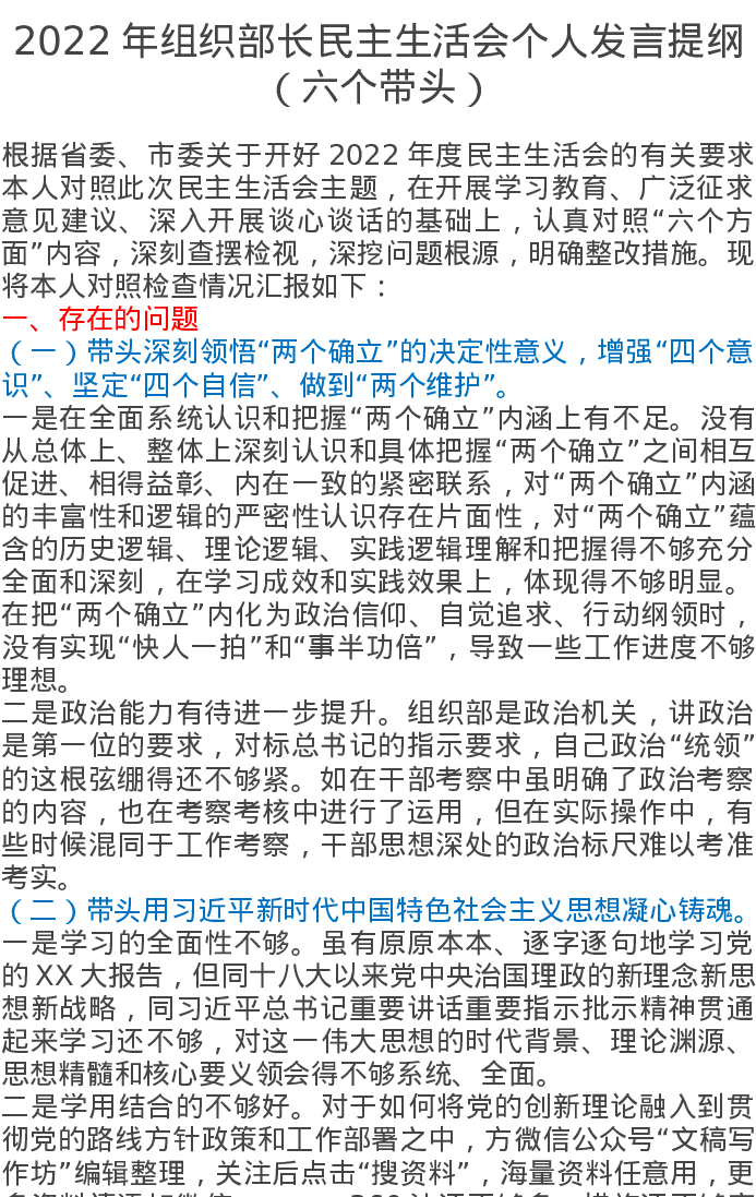 2022年组织部长民主生活会个人发言提纲(六个带头)3824字