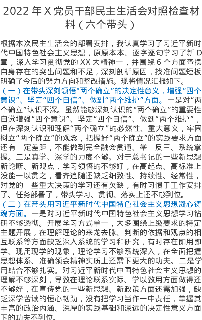 2022年X党员干部民主生活会对照检查材料(六个带头)3079字