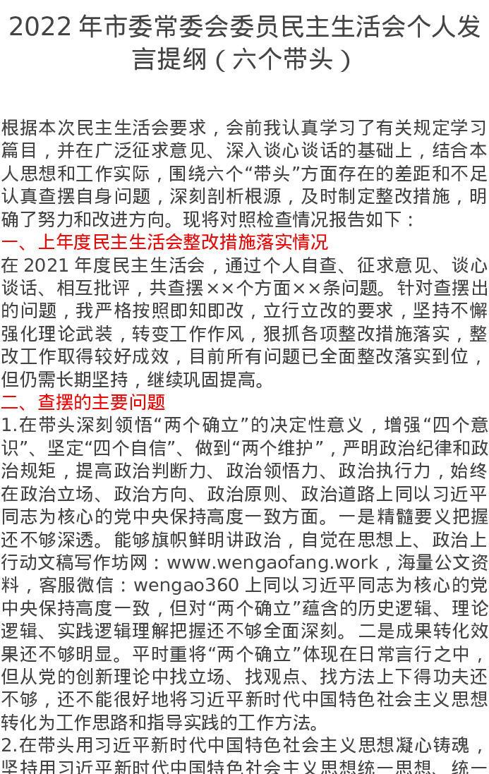 2022年市委常委会委员民主生活会个人发言提纲(六个带头)4357字
