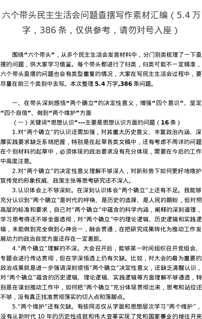 “六个带头”民主生活会问题查摆写作素材汇编(5