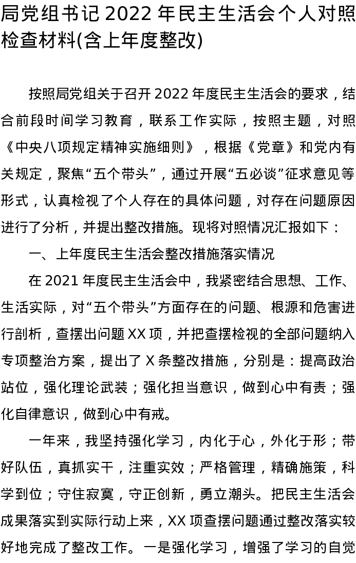局党组书记2022年民主生活会个人对照检查材料(含上年度整改)5654字