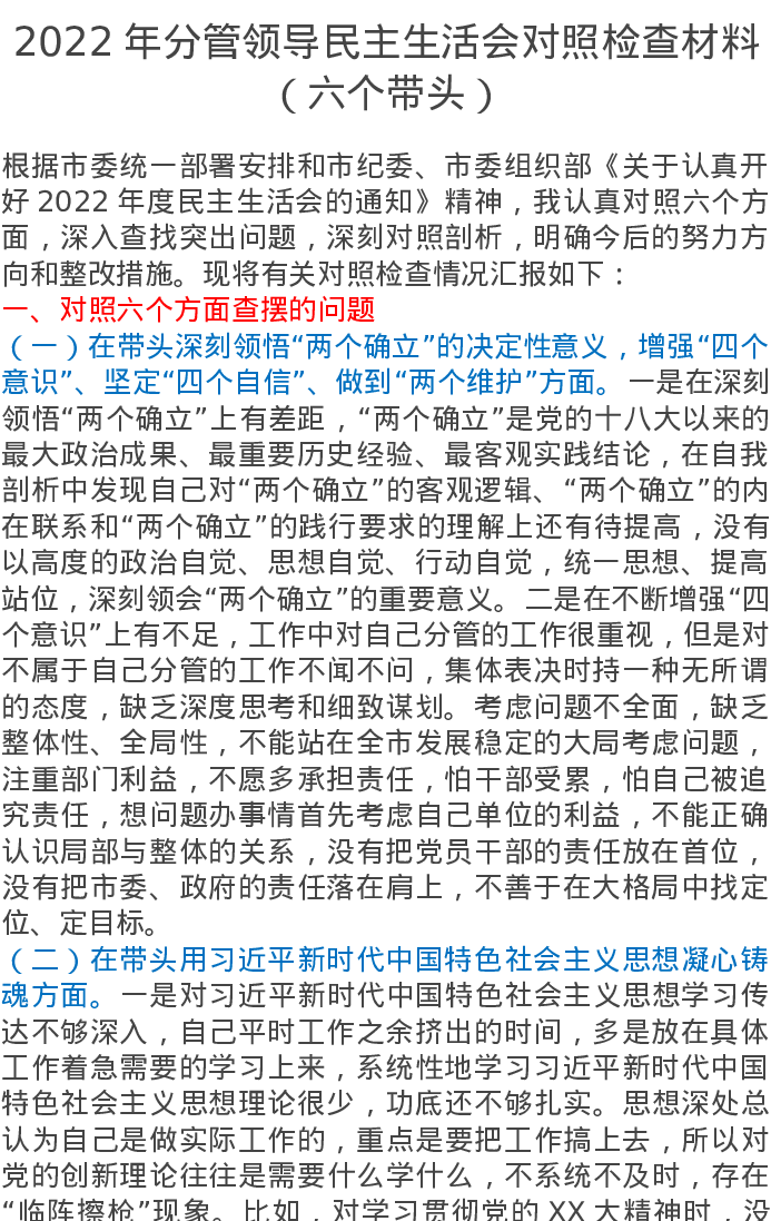 2022年分管领导民主生活会对照检查材料(六个带头)4635字