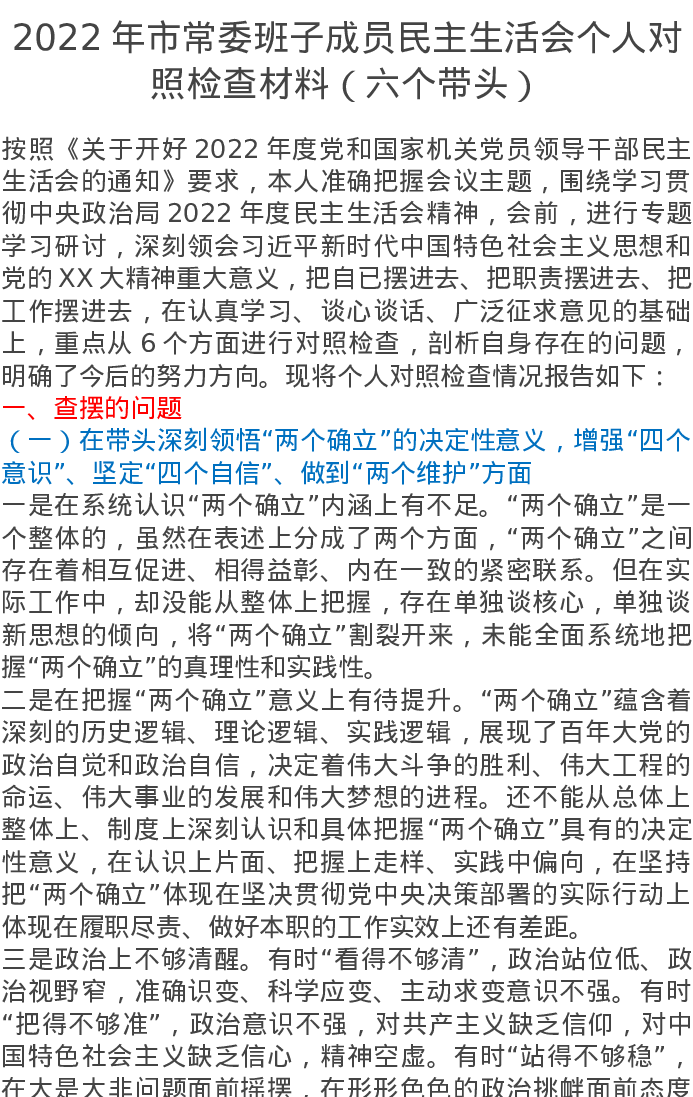 2022年市常委班子成员民主生活会个人对照检查材料(六个带头)5526字