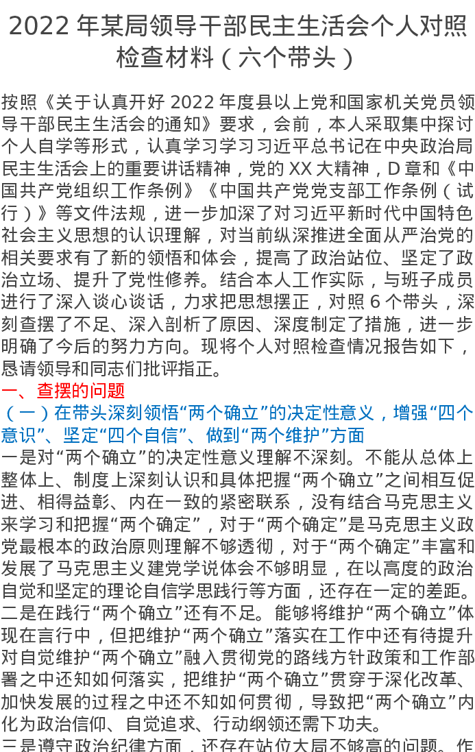 2022年某局领导干部民主生活会个人对照检查材料(六个带头)5918字