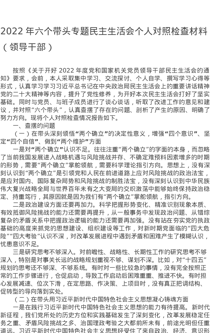 2022年领导干部专题民主生活会个人对照检查材料(六个带头)5986字