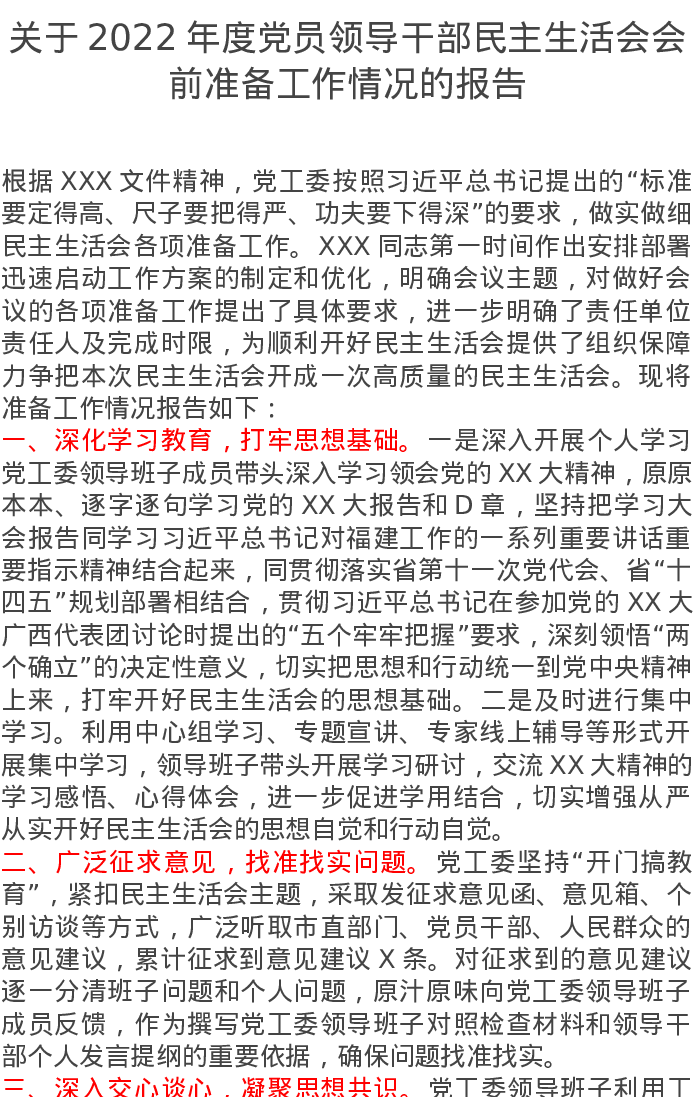 关于2022年度党员领导干部民主生活会会前准备工作情况的报告(六个带头)