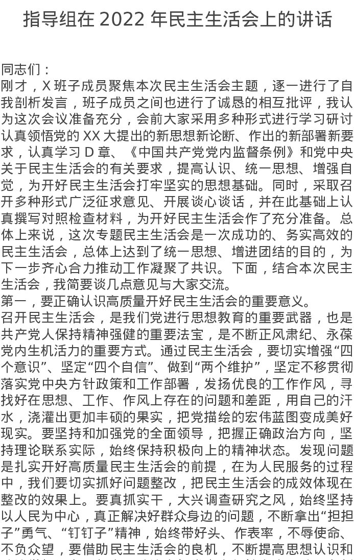 指导组在2022年民主生活会上的讲话