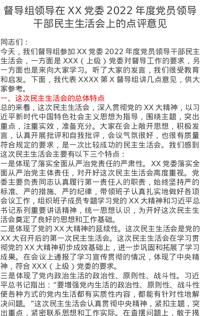 督导组领导在XX党委2022年度党员领导干部民主生活会上的点评意见