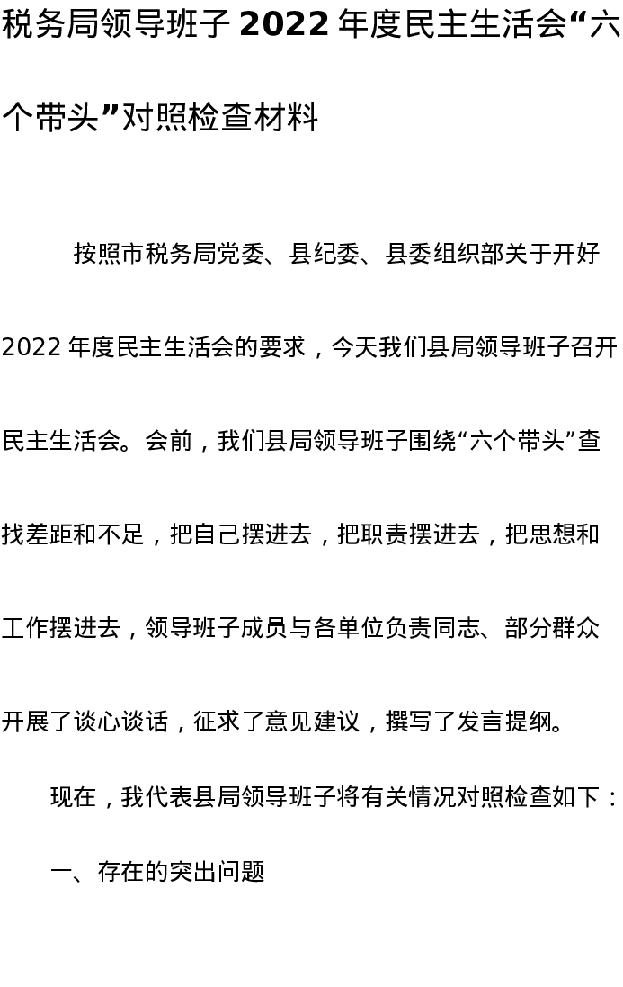 税务局领导班子2022年度民主生活会“六个带头”对照检查材料 6383字