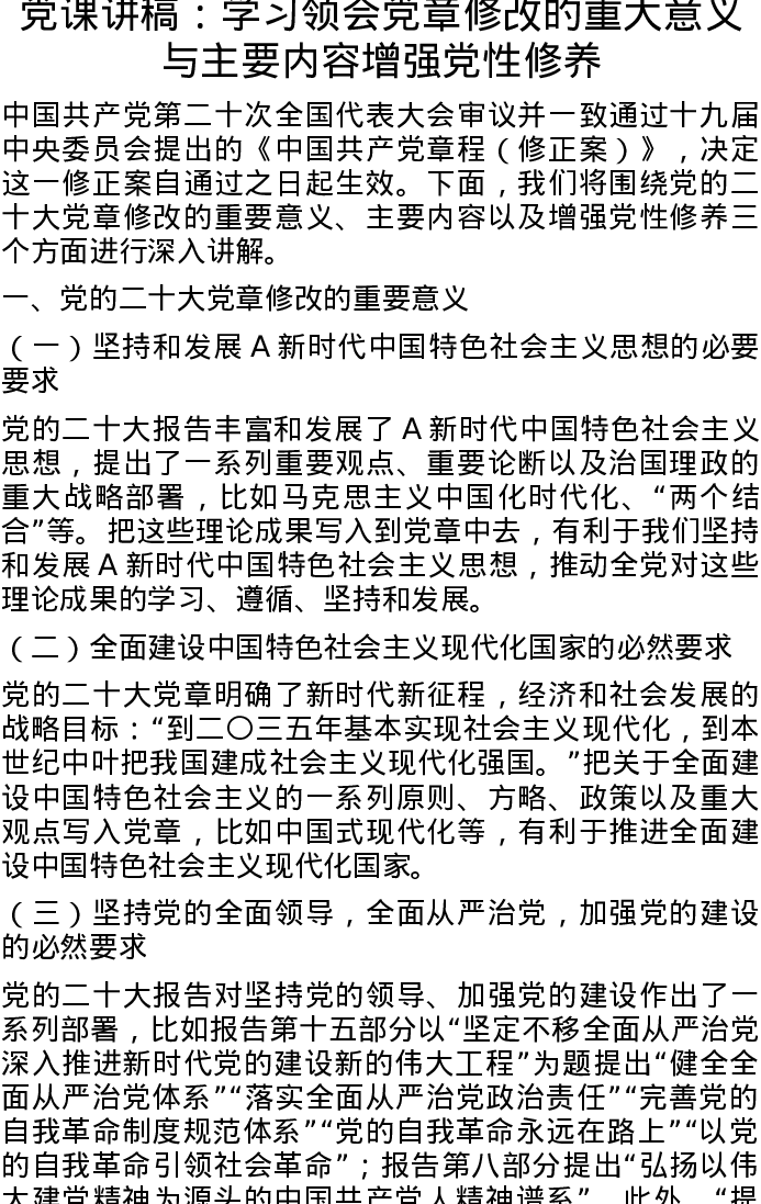 党课讲稿:学习领会党章修改的重大意义与主要内容增强党性修养