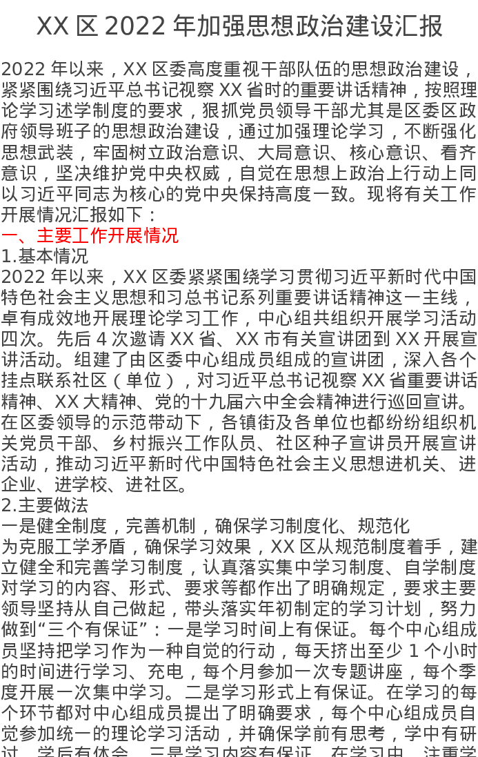 XX区2022年加强思想政治建设汇报