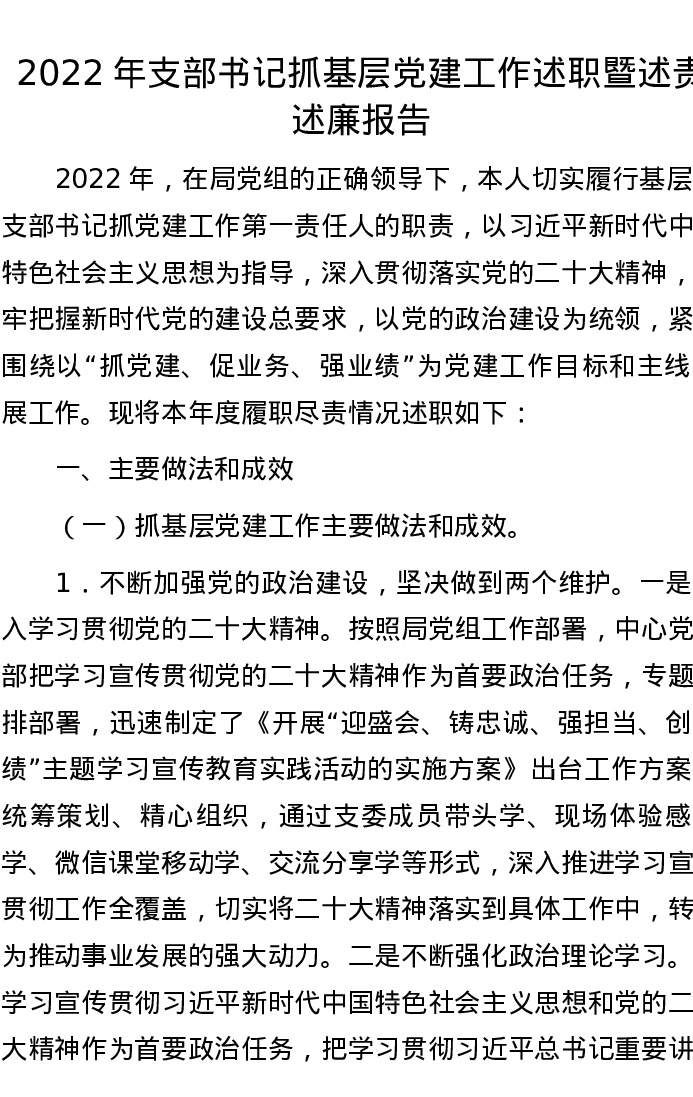 2022年支部书记抓基层党建工作述职暨述责述廉报告