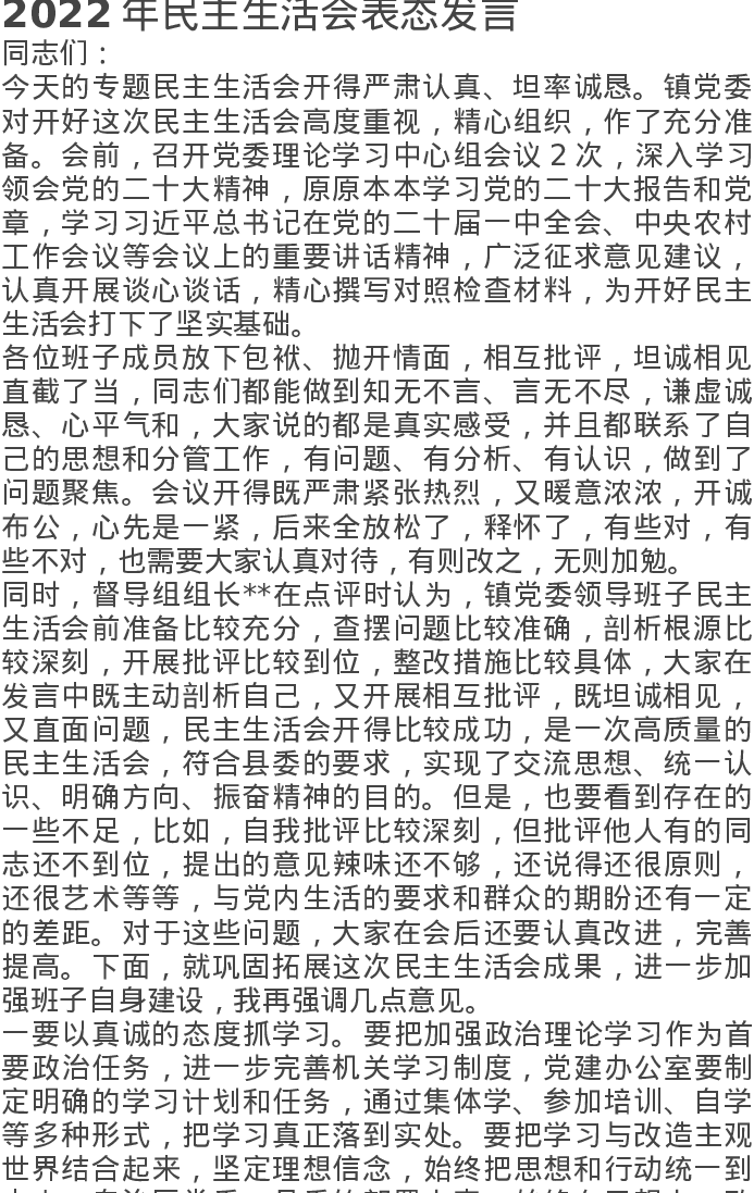 2022年民主生活会表态发言