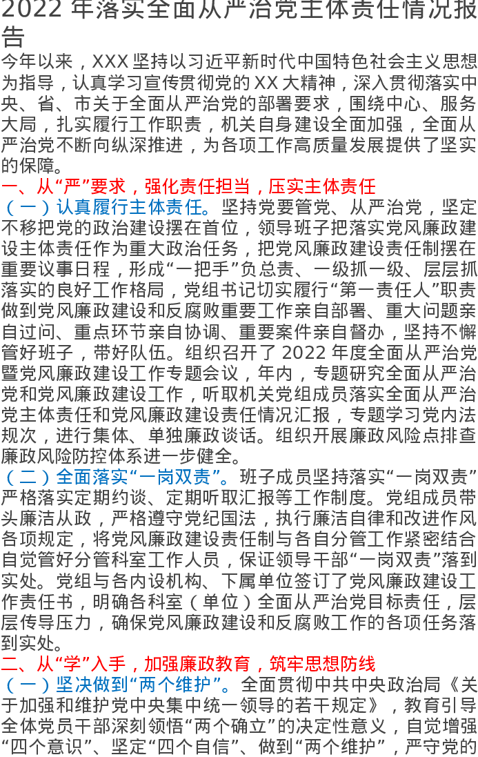 2022年落实全面从严治党主体责任情况报告