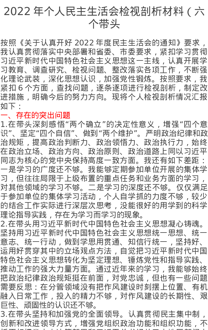 2022年个人民主生活会检视剖析材料(六个带头)
