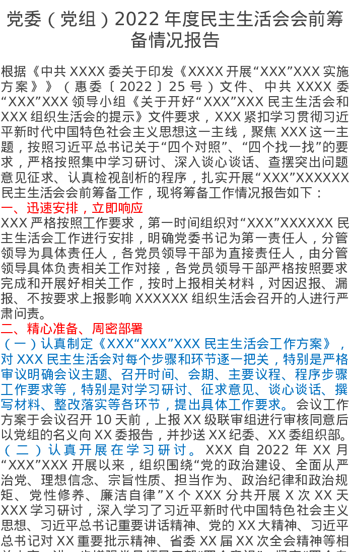 2022年党委(党组)民主生活会会前筹备情况报告