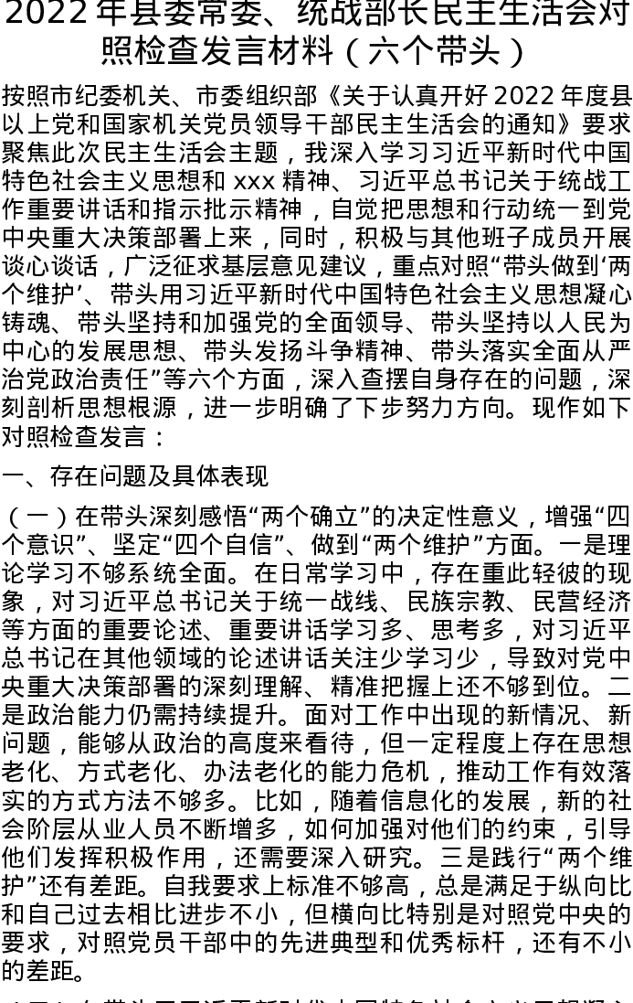 2022年县委常委、统战部长民主生活会对照检查发言材料(六个带头)