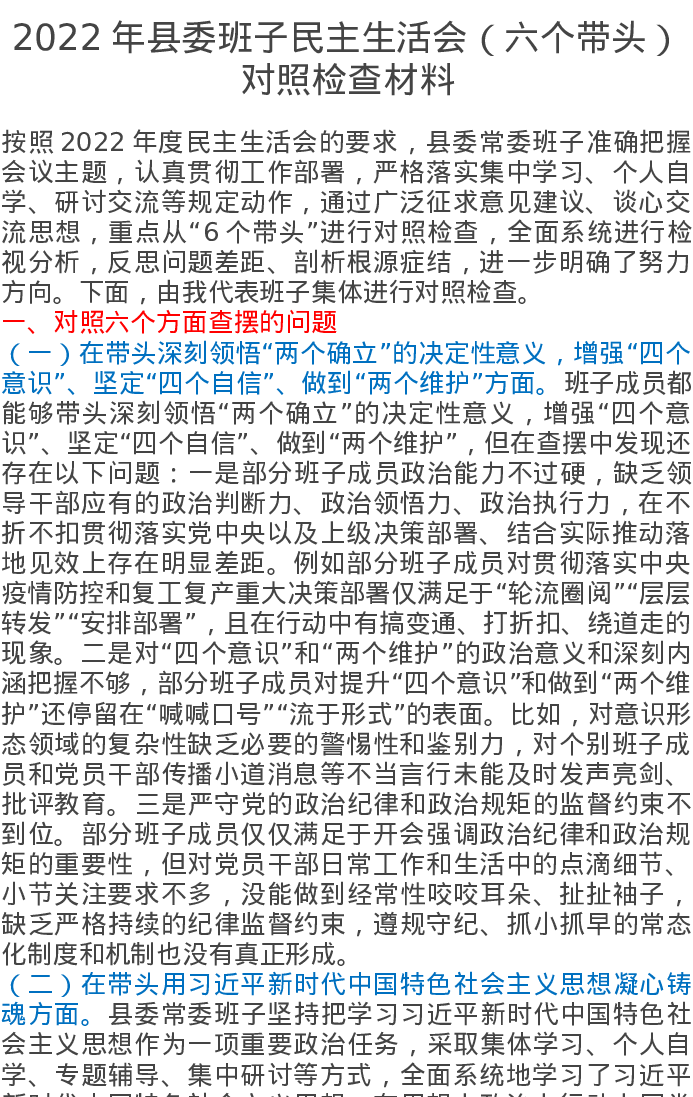 2022年县委班子民主生活会对照检查材料(六个带头)5512字