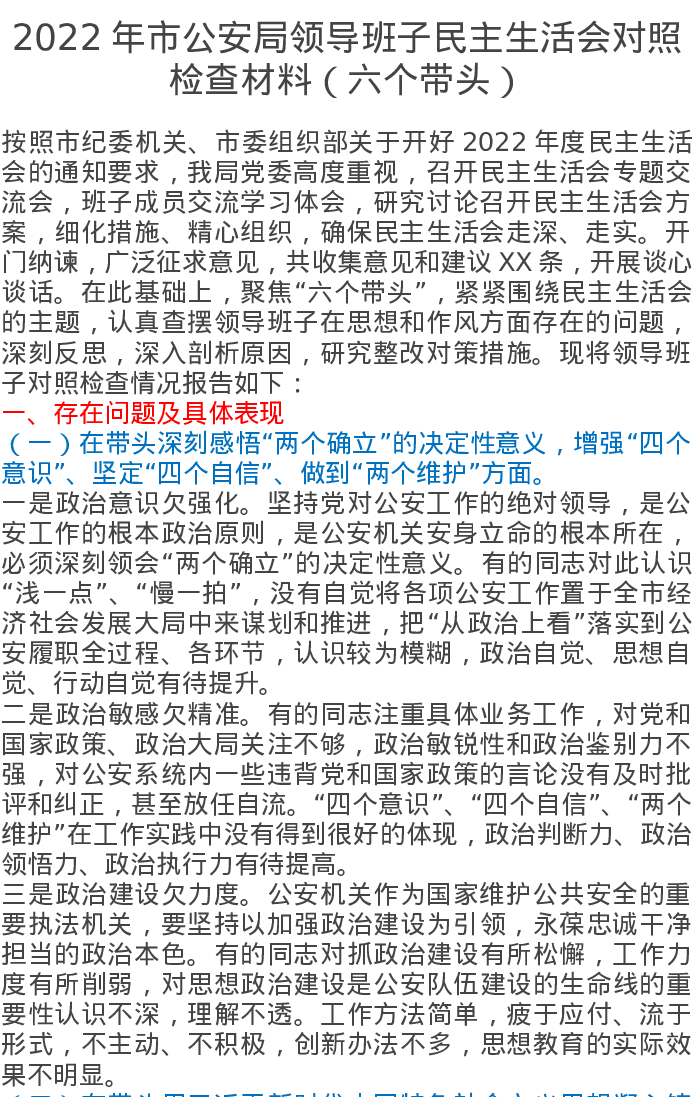 2022年市公安局领导班子民主生活会对照检查材料(六个带头)5915字