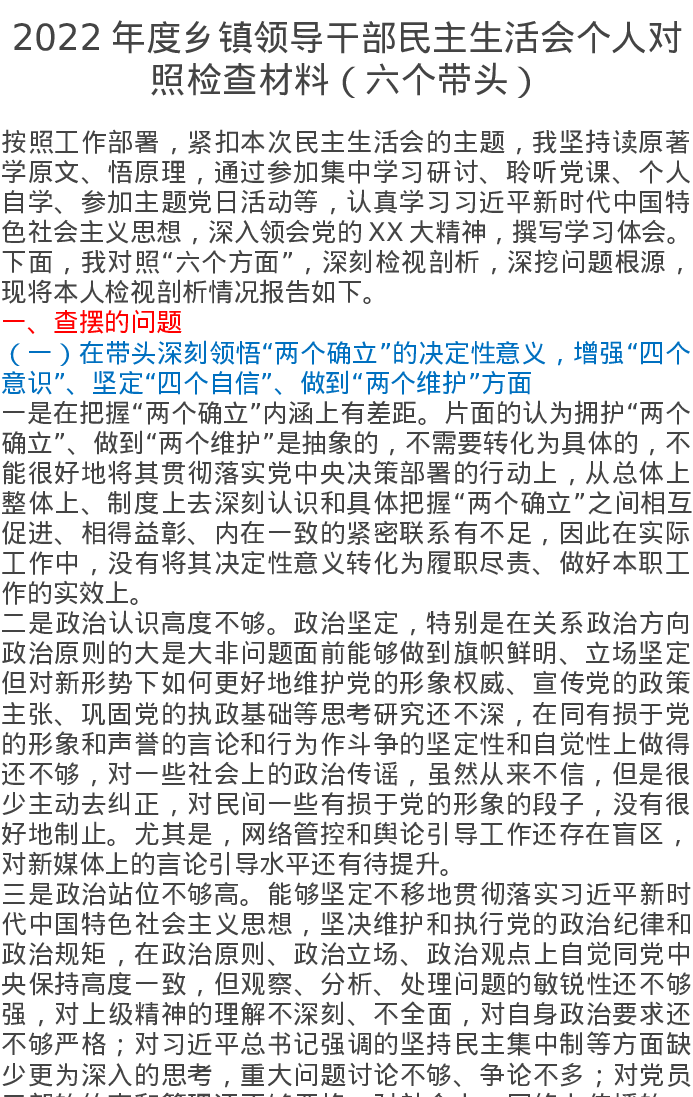 2022年度乡镇领导干部民主生活会个人对照检查材料(六个带头)5874字
