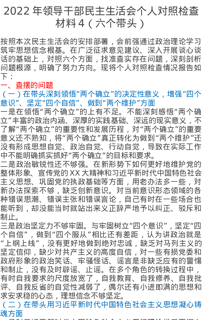 2022年领导干部民主生活会个人对照检查材料4(六个带头)5825字