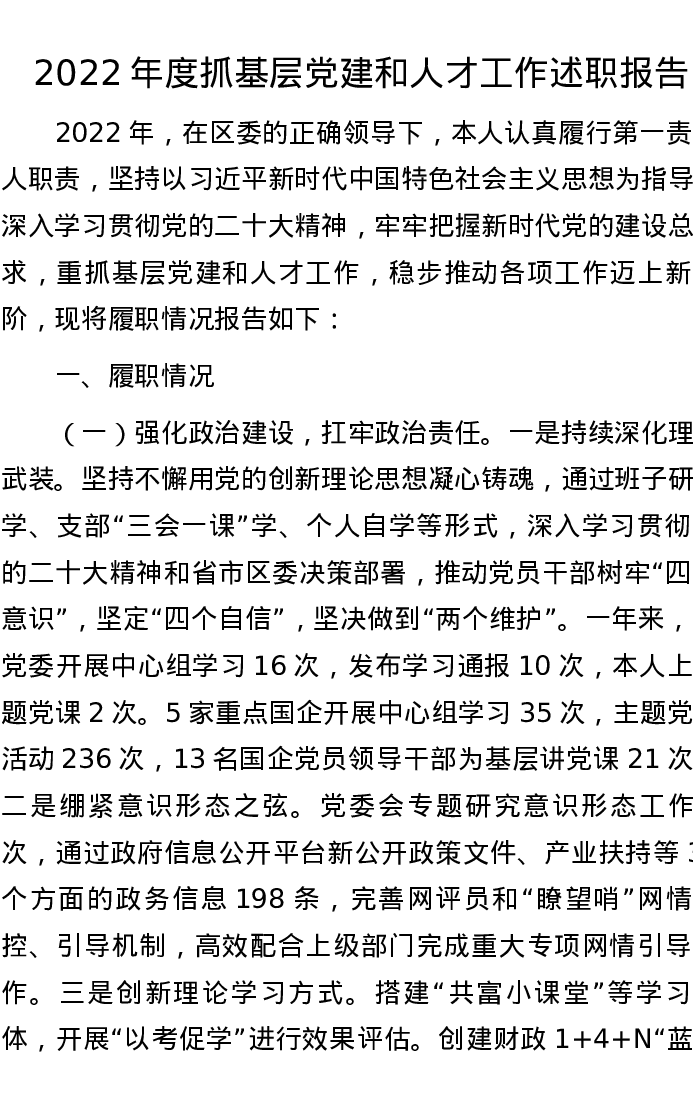 2022年度抓基层党建和人才工作述职报告