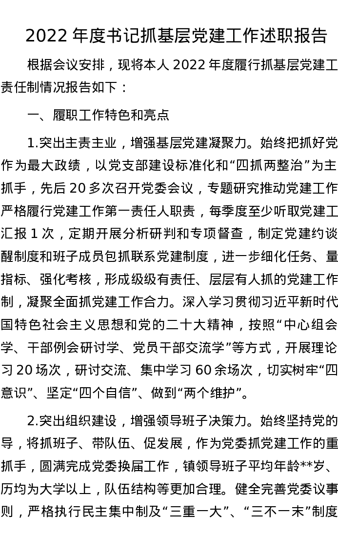 2022年度书记抓基层党建工作述职报告