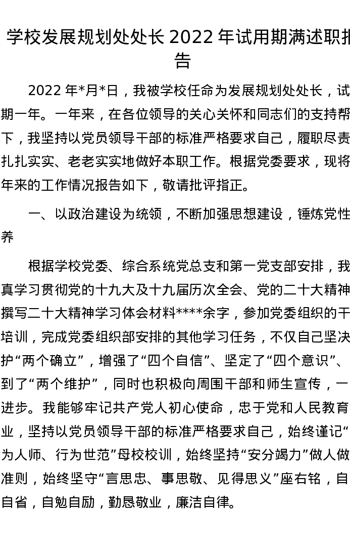 学校发展规划处处长2022年试用期满述职报告