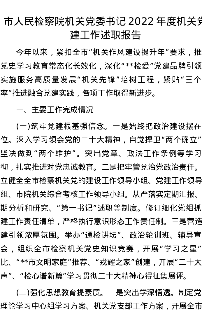 市人民检察院机关党委书记2022年度机关党建工作述职报告