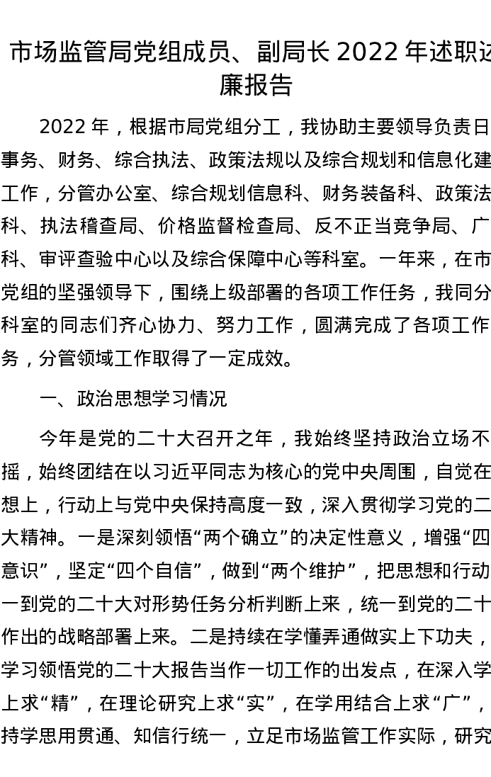 市场监管局党组成员、副局长2022年述职述廉报告