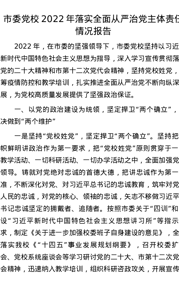 市委党校2022年落实全面从严治党主体责任情况报告