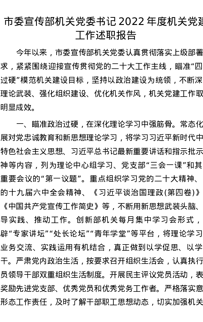 市委宣传部机关党委书记2022年度机关党建工作述职报告