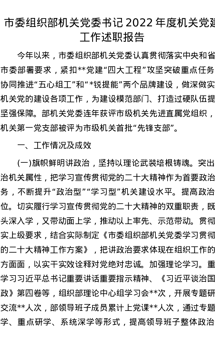 市委组织部机关党委书记2022年度机关党建工作述职报告