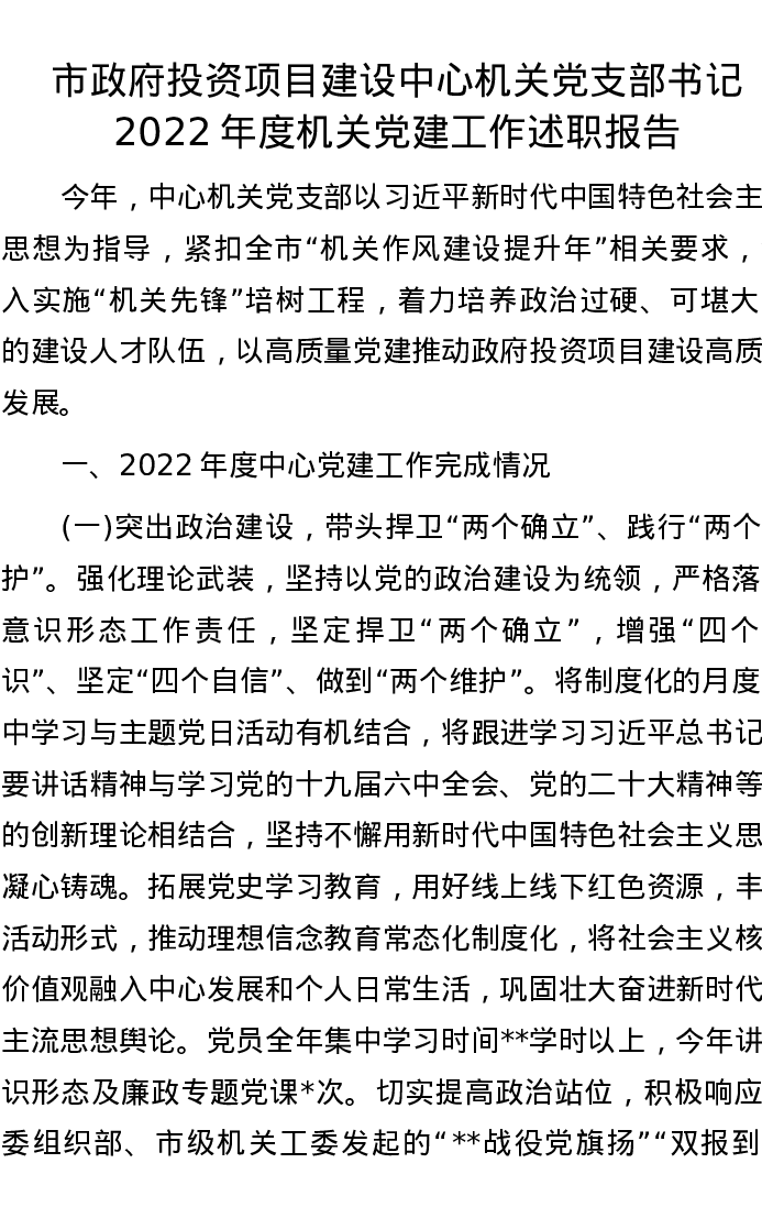 市政府投资项目建设中心机关党支部书记2022年度机关党建工作述职报告