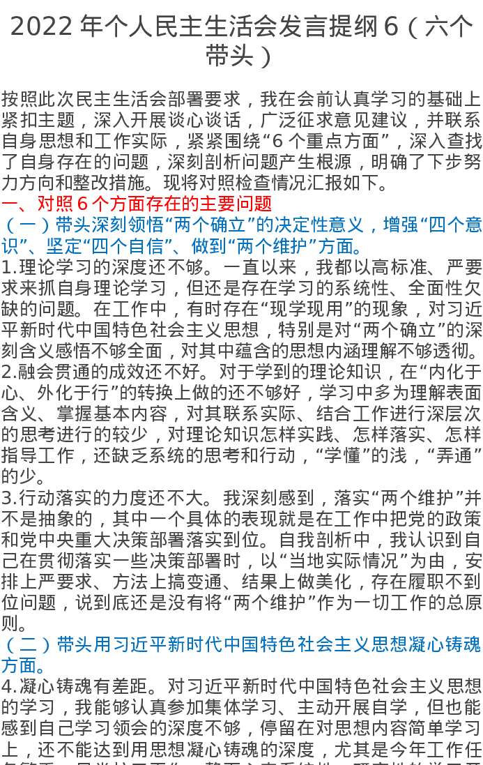 2022年个人民主生活会发言提纲6(六个带头)4560字