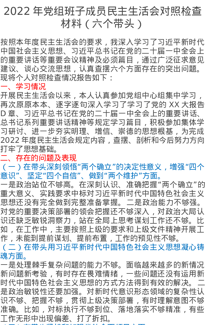 2022年党组班子成员民主生活会对照检查材料2(六个带头)3129字