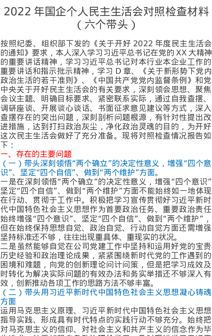 2022年国企个人民主生活会对照检查材料(六个带头)4900字