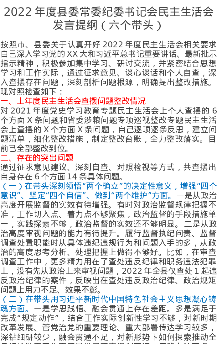 2022年度县委常委纪委书记会民主生活会发言提纲(六个带头)4134字