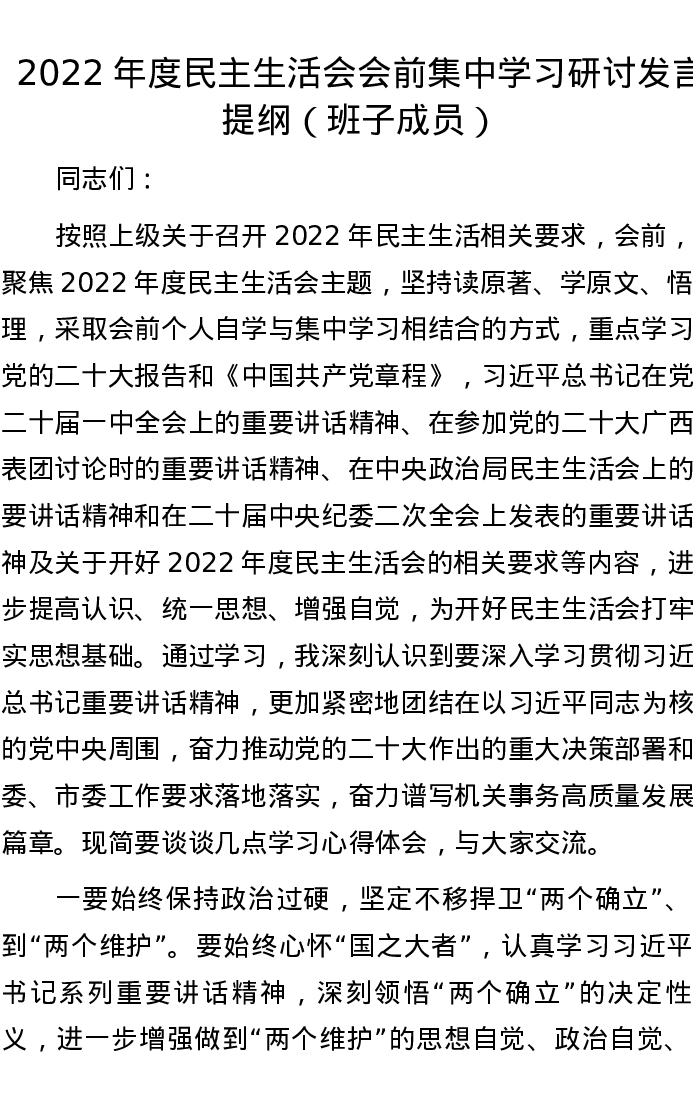 2022年度民主生活会会前集中学习研讨发言提纲(班子成员)1490字