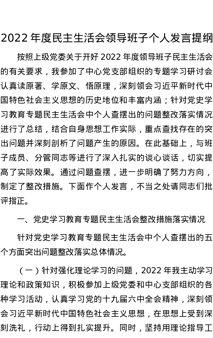2022年度民主生活会领导班子个人发言提纲 6765字