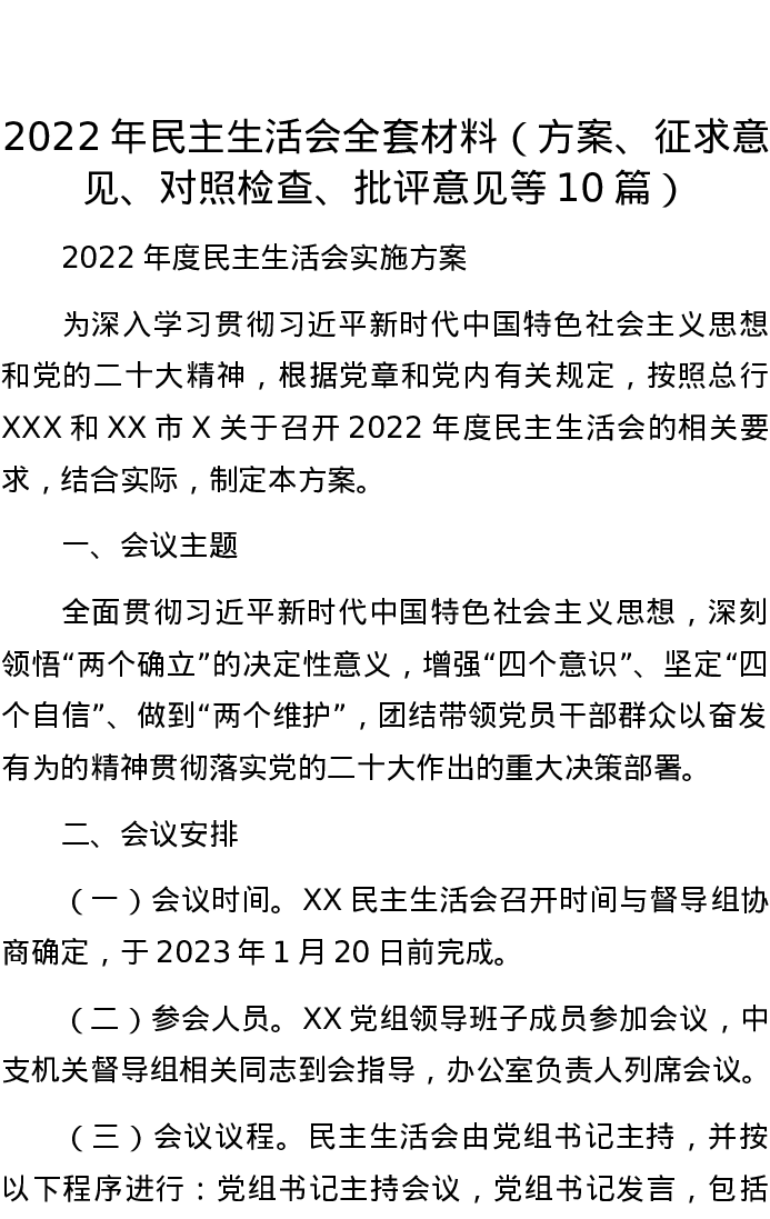 2022年民主生活会全套材料(方案、征求意见、对照检查、批评意见等10篇)