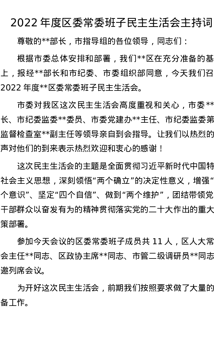 主持词:2022年度区委常委班子民主生活会主持词 2585字