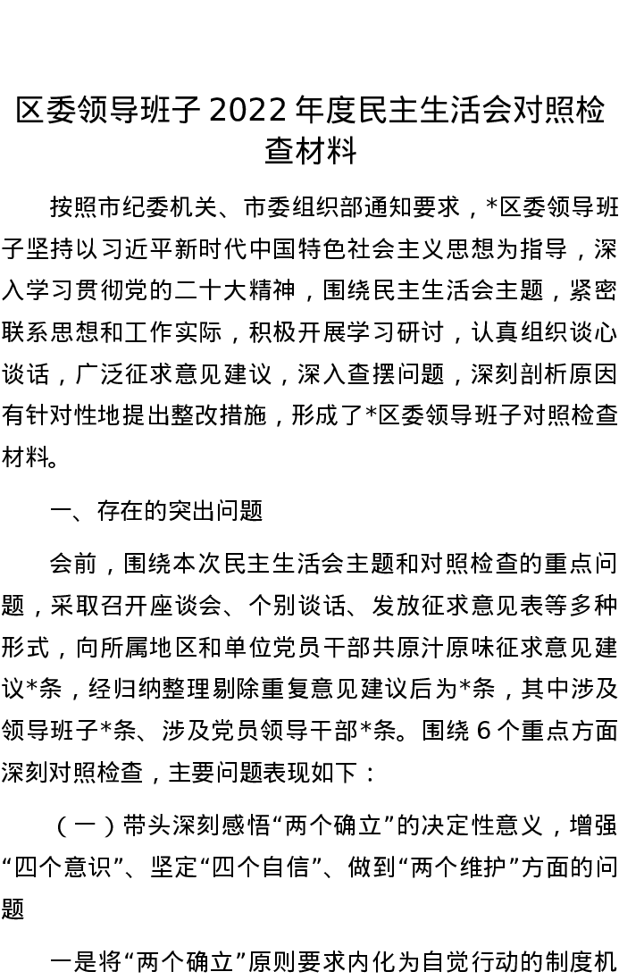 区委领导班子2022年度民主生活会对照检查材料 6123字