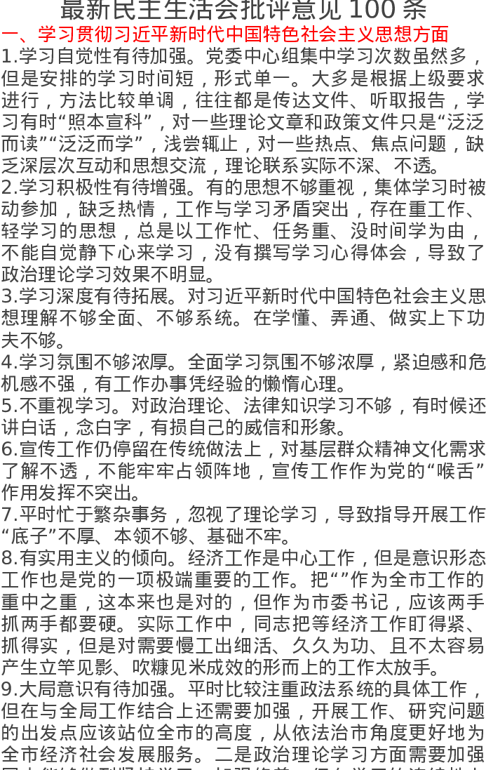 最新民主生活会批评意见100条