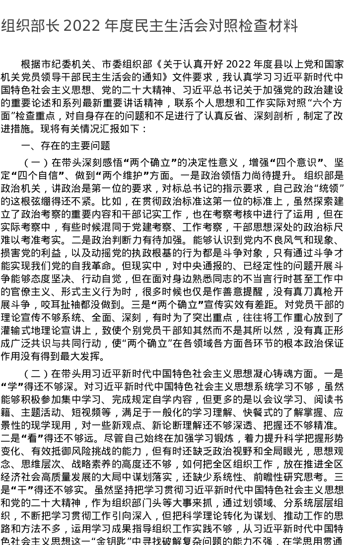组织部长2022年度民主生活会对照检查材料 4082字