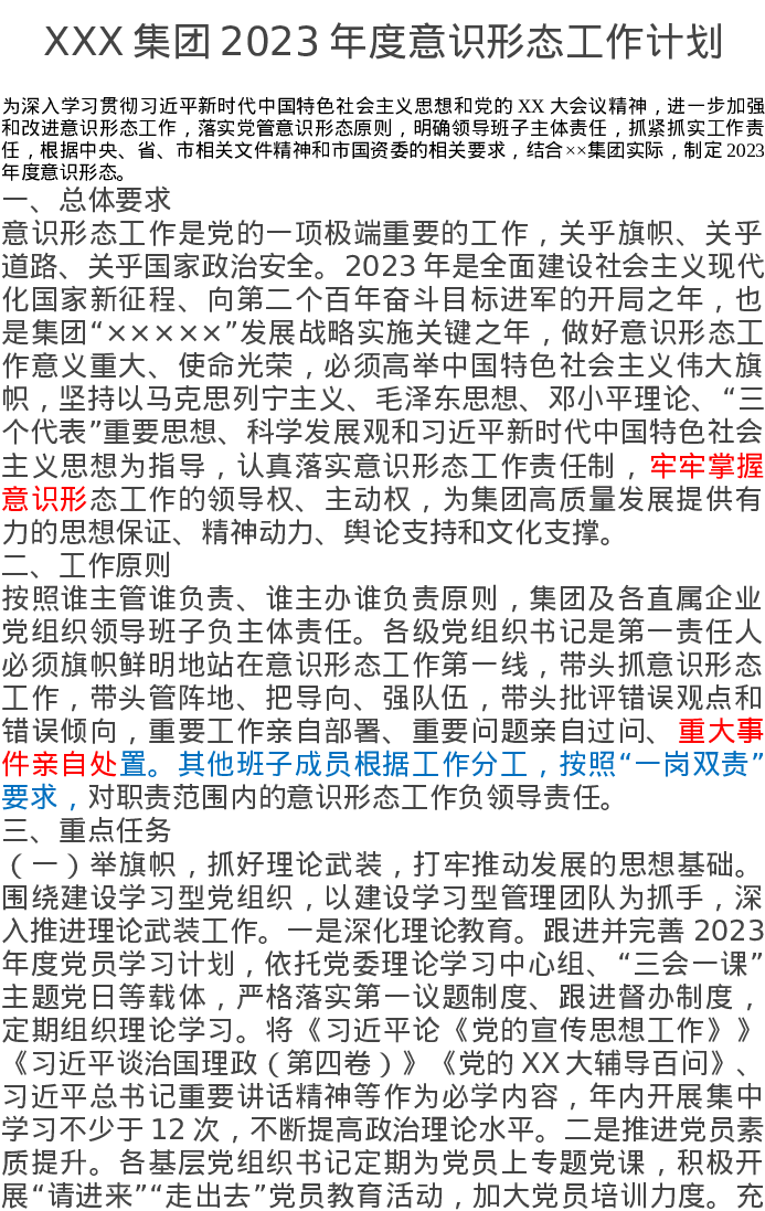 XXX集团2023年度意识形态工作计划