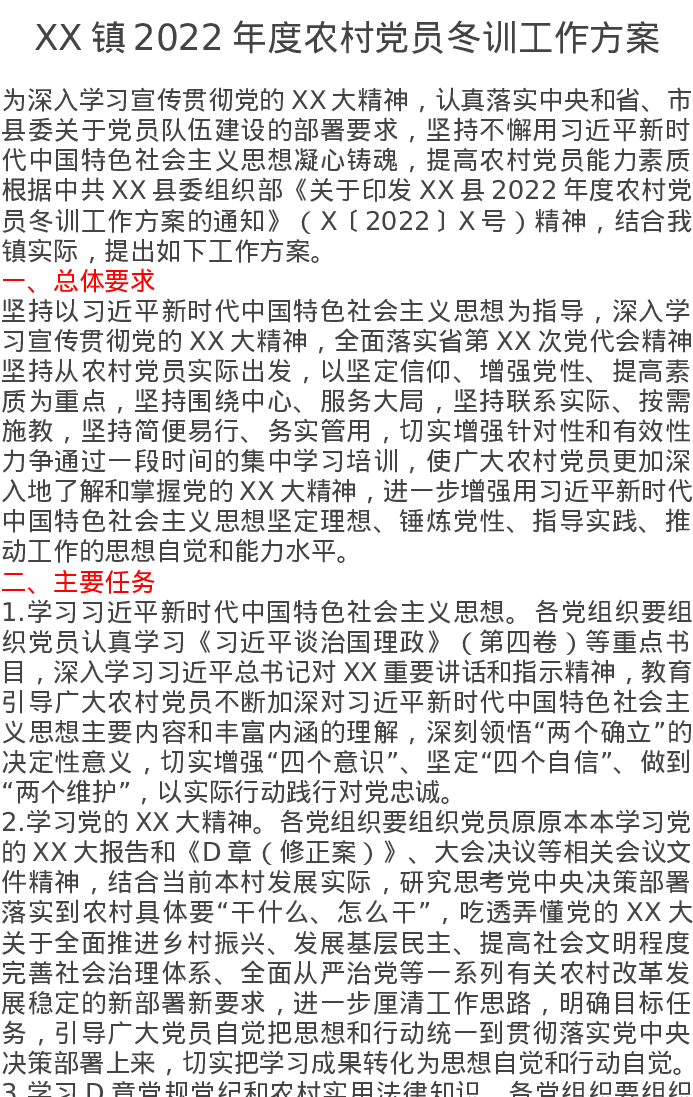 XX镇2022年度农村党员冬训工作方案